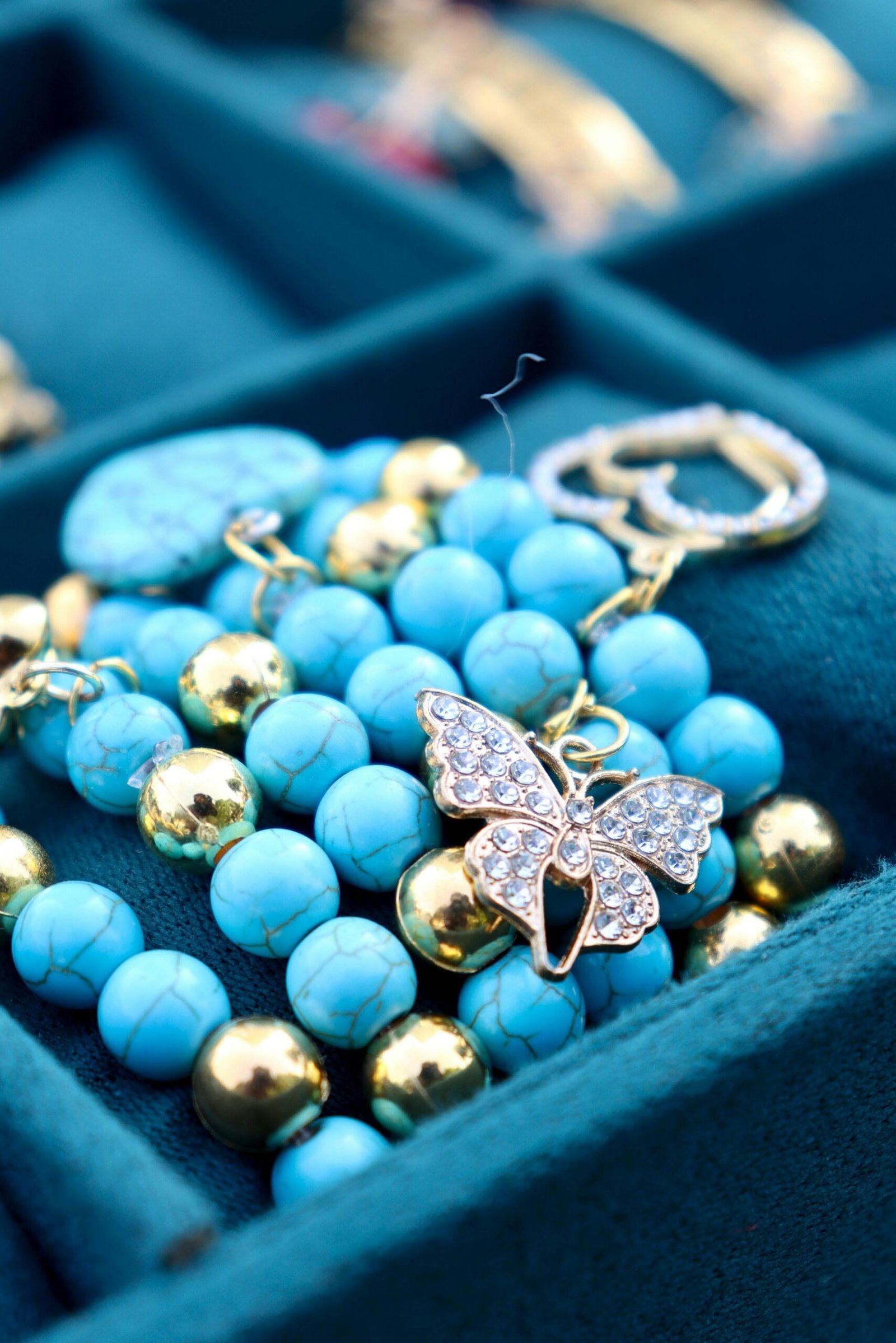 Pulsera hecha a mano con cuentas de cristal y detalles metálicos hipoalergénicos.